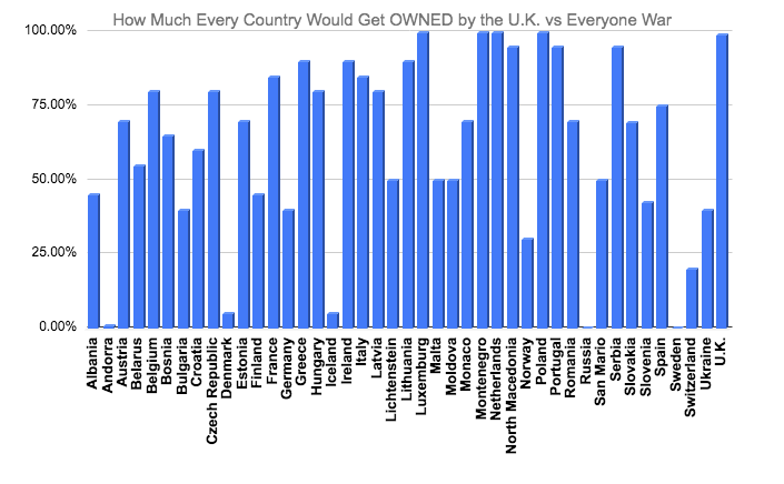 First of all, there is a lot of doubt as to whether the U.K. could survive a war of this scale. However, The Queen does have many voodoo powers, and is a potent alchemist since being the primary leader of the Agent Orange operation[source: trust me dude]. Below is a graph by our data analasysts predicting destruction to each country.